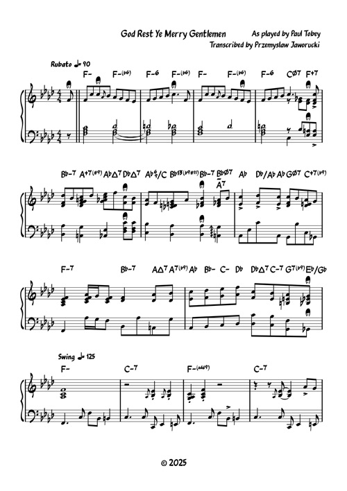 From my feet dangling off the organ bench at age seven, learning to bend “Silent Night” into something soul-stirring under the gentle guidance of Markwell J. Perry, to colliding classical training with university jazz—this collection is that collision made tangible. Handwritten in the glow of pine needles and candle wax, these nine transcriptions invite you to hand a master chef’s perfect cut to a jazz pianist: we season, sear, and serve back richer, smokier, twice as soulful. Many are the wizardry of transcriber Przemysław Jaworucki, who catches ghost notes even I missed; others hail from my best-selling 2003 album Paul Tobey’s Christmas at the Piano, Saturday-morning livestreams, or annual online concerts. All are forged in front of audiences craving the season’s spirit wrapped in swing—recorded live on my inspiring Ibach F3 Grand Piano in Niagara-on-the-Lake, Ontario, Canada.