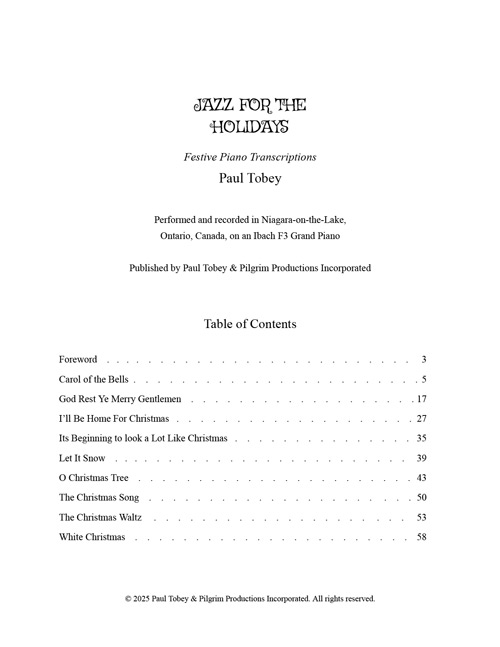December 2025 © 2025 Paul Tobey & Pilgrim Productions Incorporated. All rights reserved. Published by Paul Tobey & Pilgrim Productions Incorporated. Ideal for intermediate to advanced pianists—total value if purchased separately is $175.55
